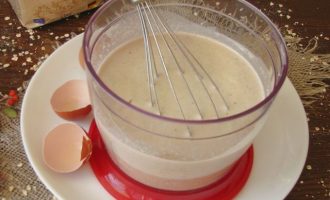 Сразу же влейте теплое молоко, всыпьте просеянную овсяную муку и пробейте в погружном миксере до однородного состояния.