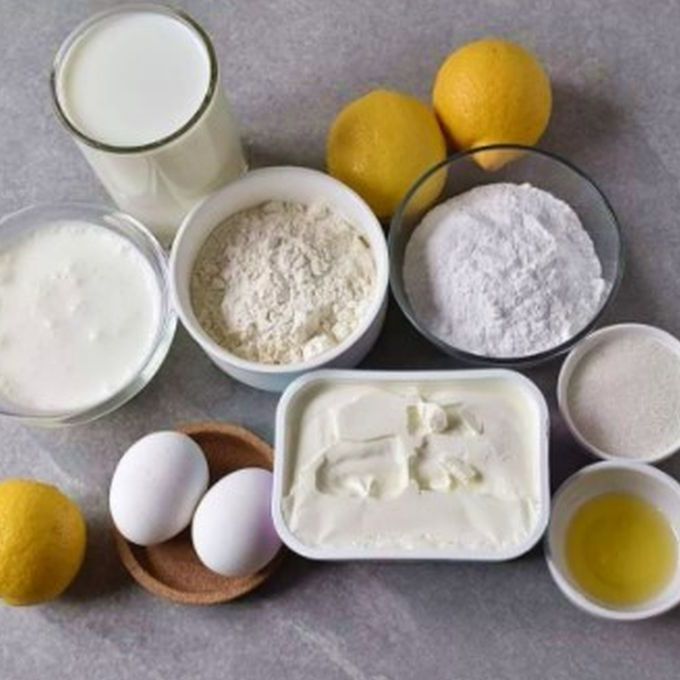 Для приготовления лимонного блинного торта с глазурью, вначале подготовьте все ингредиенты. Потребуется для блинчиков мука, молоко, сахар, яйца, соль, сливочное и растительное масло. Также все компоненты для сливочного лимонного крема и глазури.