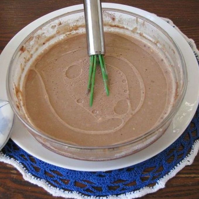 В яичную смесь всыпьте 250 грамм пшеничной муки и 25 грамм какао-порошка.