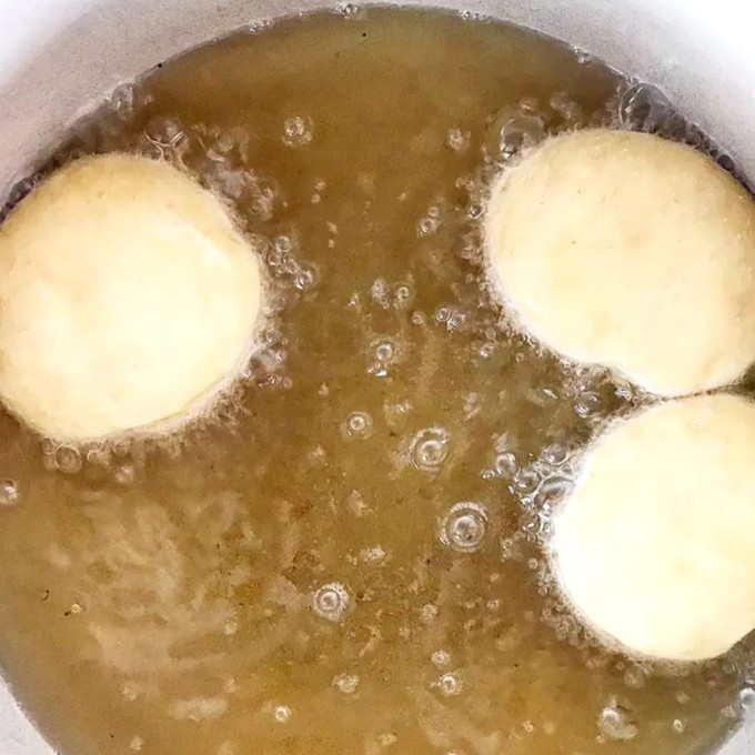 Готовим по 1,5-2 минуты с каждой стороны. Переворачивайте пончики аккуратно. Я использую кондитерские щипцы или ложку-шумовку.
