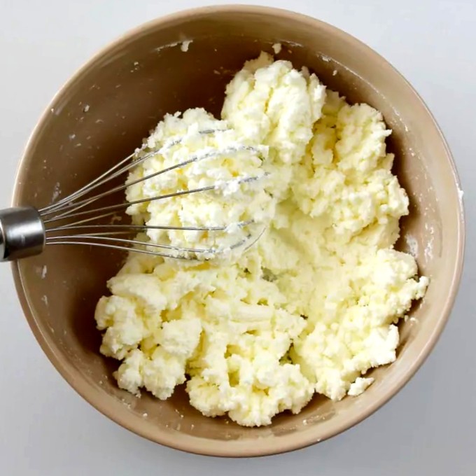 Взбиваем творог до получения пасты — он должен быть очень мягким.
