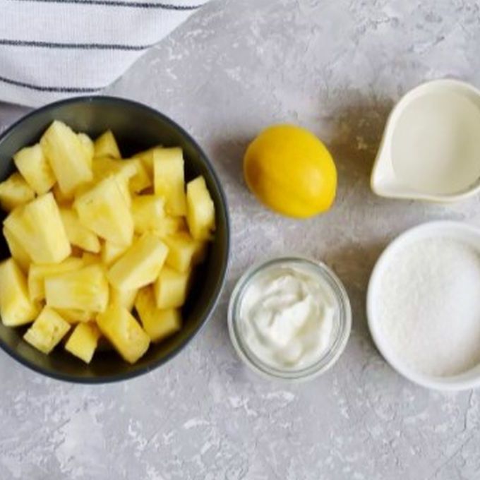 Для приготовления сливочного ананасового сорбета, вначале подготовьте все ингредиенты. Ананас купите лучше свежий, но если его нет — замените на консервируемый. Сливки натуральные, а что касается жирности, то берите по своему предпочтению. У меня 30% жирности.