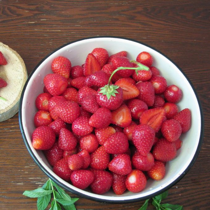 Для приготовления варенья из клубники с мятой подготовьте все компоненты. Клубнику выберите среднюю по размерам, целую и не переспевшую. Кроме ягод еще потребуется сахар, вода и свежая мята.
