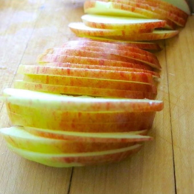 Яблоки разрежьте пополам, удалить сердцевину и тонко нарежьте. Из двух с половиной яблок получилось 11 яблочных роз.