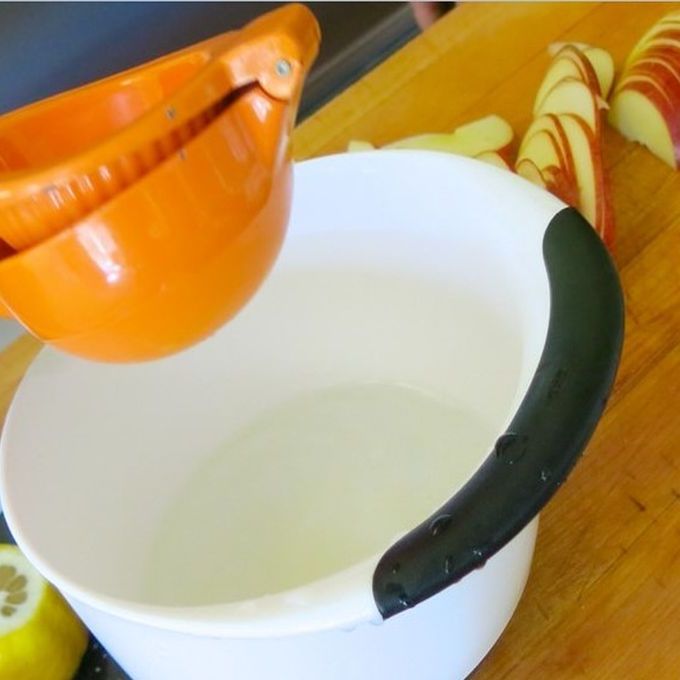 Яблочную нарезку опустите в воду с лимоном, пусть постоят пол минутки, чтобы не потемнели. Убедитесь, что ломтики полностью погружены в воду. Потом отправьте в микроволновку на три минуты.