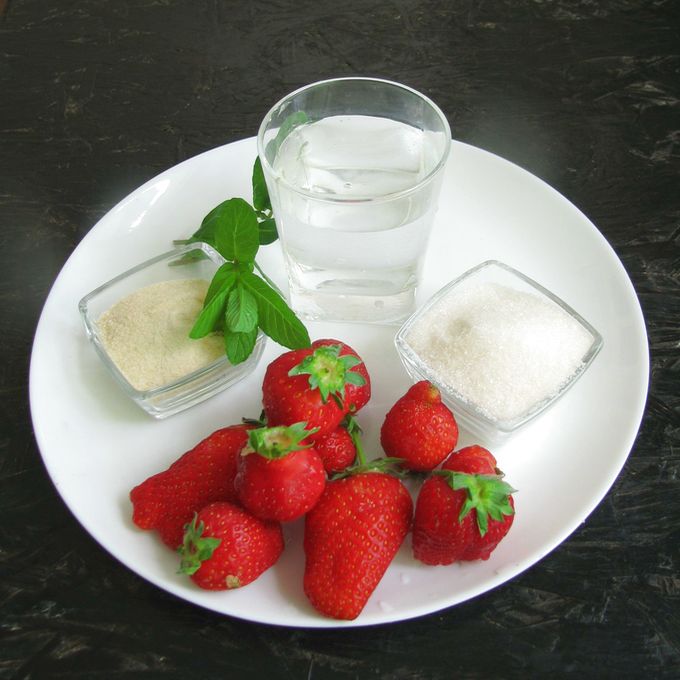 Перед началом приготовления клубничного желе подготовьте все компоненты. Свежую клубнику, а если придется готовить в не летнего сезона, тогда можно использовать консервированную или замороженную. Из желирующих веществ — желатин, а в летнее время предпочтительней брать агар-агар, так как он быстрей застывает и дольше сохраняет консистенцию (даже при комнатной температуре). Так как натуральной сладости недостаточно, то еще возьмите сахар.