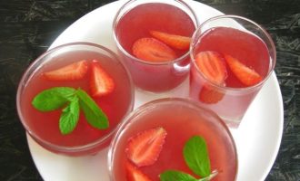 Набухший желатин введите ягодный отвар, доведите до кипения, но не кипятите. Затем в подготовленные стеклянные формочки или стаканы, выложите на дно нарезанную клубнику и немного залейте желейным отваром. Поставьте в холодильник до полного застывания.
