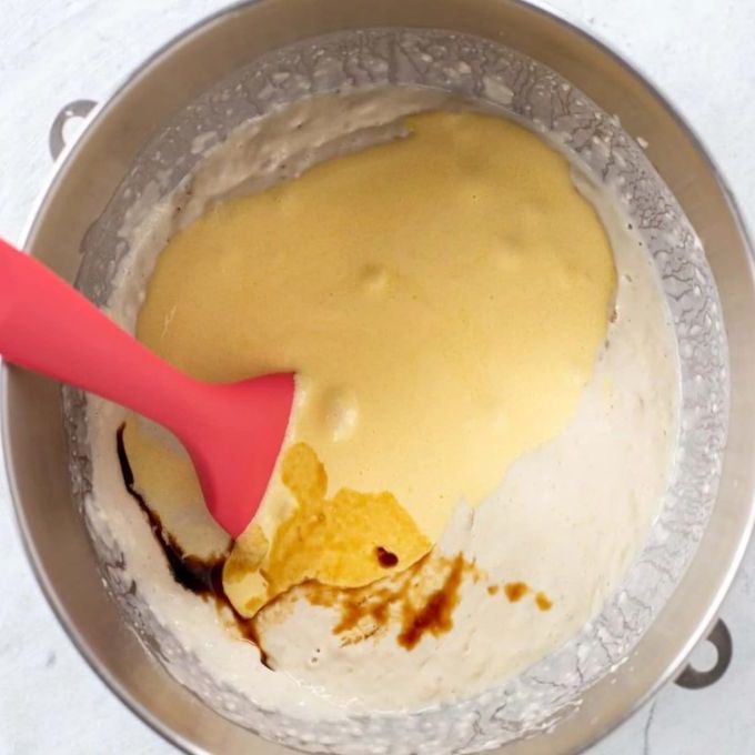 Вмешайте яичные желтки в тесто, затем масло, ванильный экстракт и яичные белки.