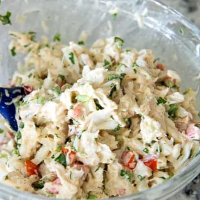 Вы можете немного украсить готовое блюдо свежей зеленью укропа или петрушки. Количество соли и специй в салате регулируем на свой вкус. При желании вы можете смело заменить крабовое мясо на измельчённые крабовые палочки.