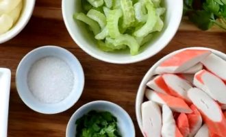 Собираем необходимые продукты — нарезаем в произвольной форме крабовые палочки и сельдерей. Измельчаем свежую зелень, отмеряем ингредиенты для заправки.