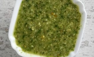 Отложенные кедровые орехи растолките вместе с 20 грамм свежего базилика, двумя зубчиками чеснока, тертым сыром пармезан и 75 грамм оливкового масла первого отжима. Перемешайте и попробуйте на вкус.