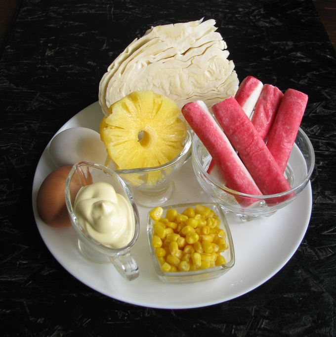 Перед началом приготовления салата с крабовыми палочками с ананасами подготовьте все компоненты. Кроме основных ингредиентов взята свежая капуста, но ее по своему желанию можете заменить на свежие огурцы. Заправляется оливковым майонезом, смешанным со сметаной хорошего качества.