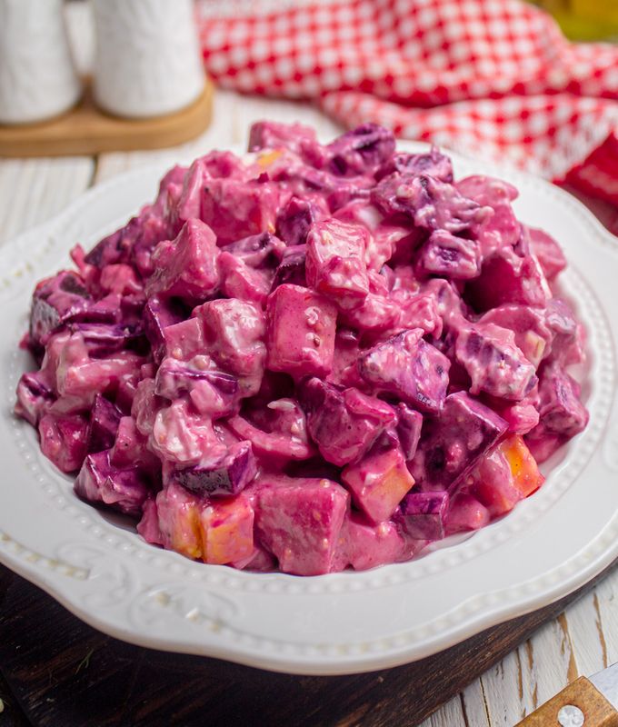 У меня сегодня салат со свеклой и селедкой, который готовится просто и быстро, учитывая, если не нужно будет разделывать селедку на чистое филе. Советую свеклу в этом салате использовать в запеченном виде, а не в отварном, тогда вкус блюда будет более насыщенным и вкуснее. Для маринования лука предлагаю взять рисовый уксус (он гораздо нежнее столового). Весь продуктовый набор для салата нужно нарезать кубиками и заправить домашним майонезом с горчицей и лимонным соком, хотя подойдет и обычный майонез любимой марки из магазина по соседству.