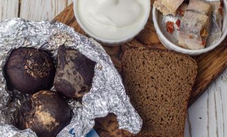 Для приготовления сельди под шубой свечи подготовьте все ингредиенты: свеклу возьмите средних размеров, заверните в фольгу и запеките, сельдь купите в виде тушки и разделайте на филе или же купите уже готовое филе. У меня филе с приправами. Также потребуется для основы ржаной хлеб, сметана, желатин или агар-агар, да плюс специи и приправы.