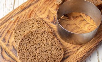 Из ржаного хлеба вырежьте «дно» для будущей закуски. По размеру хлеб должен такой же как и сама форма. У меня форма в диаметре 8 см.