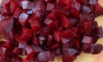 Вареную свеклу извлеките из кастрюли, охладите, очистите от кожуры и нарежьте ее кубиками.