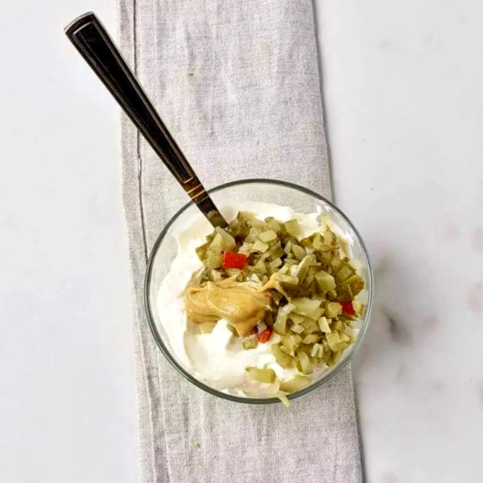 В удобной пиале соединяем все ингредиенты — примерно полстакана майонеза, остренькую горчицу, нарезанные или тёртые маринованные огурцы и свежевыжатый лимонный сок.