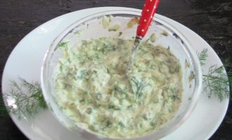 В миске все компоненты соедините и попробуйте на свой вкус. Если нужно, то еще добавьте соль. Соус огуречный хорошо перемешайте.