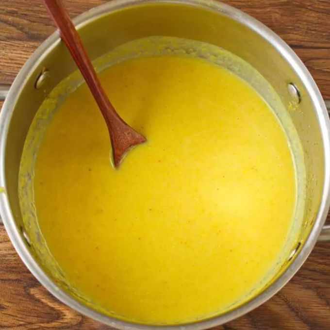 Используя погружной блендер, взбейте суп до однородного пюреобразного состояния.