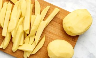 Нарезаем картофель соломкой — не слишком толстой и желательно одинакового размера.