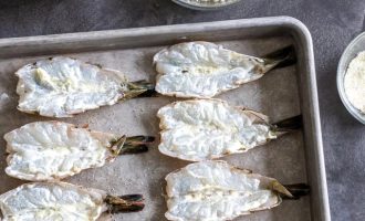 Снимаем с креветок панцирь и аккуратно разрезаем каждую вдоль, раскрываем креветку как книжечку. Хвостик можно оставить, а можно и срезать.