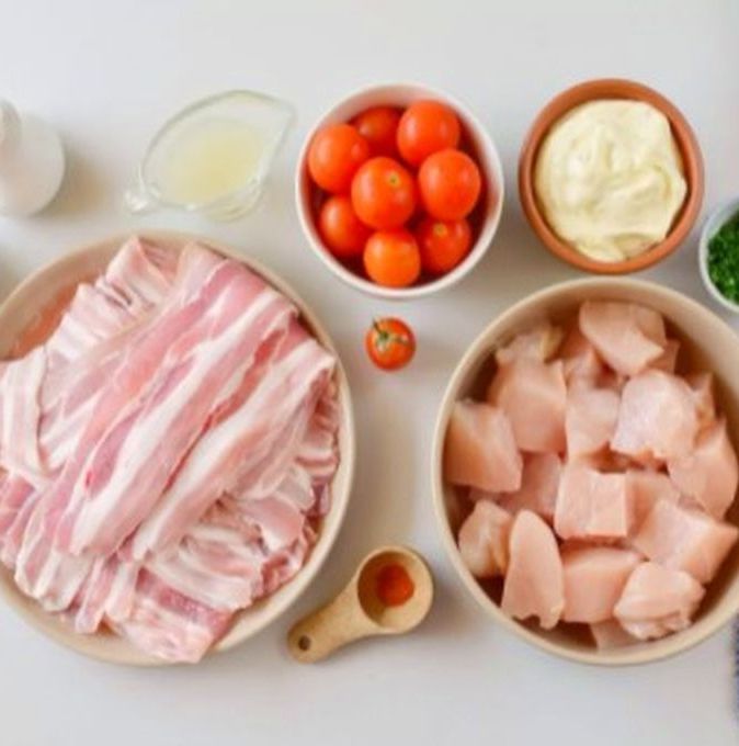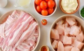 Для приготовления шашлыков из курицы с беконом и соусом ранч, вначале подготовьте все ингредиенты. Бекон купите уже нарезанный в фасовке или нарежьте указанное количество на 14 лент, по 2 штуки на один шампур. Соус ранч купите или приготовьте сами в домашних условиях, по рецепту, который вам больше нравиться.