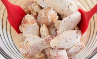 Выложите крылышки в миску, добавьте чесночную приправу и перемешайте при помощи силиконовых лопаток. Отправьте в холодильник на 2 часа, чтобы крылья хорошо пропитались.