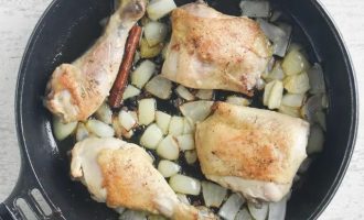 У меня сегодня жареная курица с добавлением изюма, кедровых орехов, корицы и слив, которые придают блюду очень интересный букет вкусов. Для этого рецепта жареной курицы я использую 2 куриных бедра и 2 окорочка. Сначала приправляем их солью и перцем, а затем подрумяниваем на сковороде с 2 столовыми ложками оливкового масла сначала со стороны кожицы, чтобы они потеряли жир, а затем со всех остальных частей, пока они не станут золотисто-коричневыми.