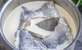 Треску очистите от чешуи, удалите плавники и внутренности. Нарежьте на кусочки. В кастрюле нагрейте по 125 мл молока со сливками. Когда все закипит, добавьте треску, накройте крышкой, снимите с огня и оставьте на 10 минут, чтобы треска приготовилась на остаточном тепле. Слейте и зарезервируйте оба отдельно.