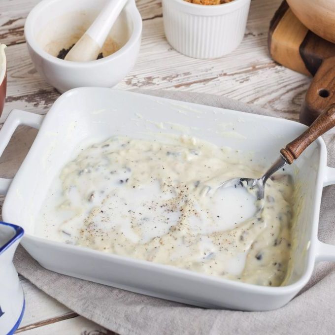 Смешайте грибной соус, молоко и перец в удобной жароупорной посуде, которую предварительно смажьте маслом. Для грибного соуса шампиньоны переберите, промойте в холодной воде и мелко измельчите. Поджарьте слегка на сливочном масле, влейте сливки и проварите 2-3 минуты. В самом конце доведите до вкуса.