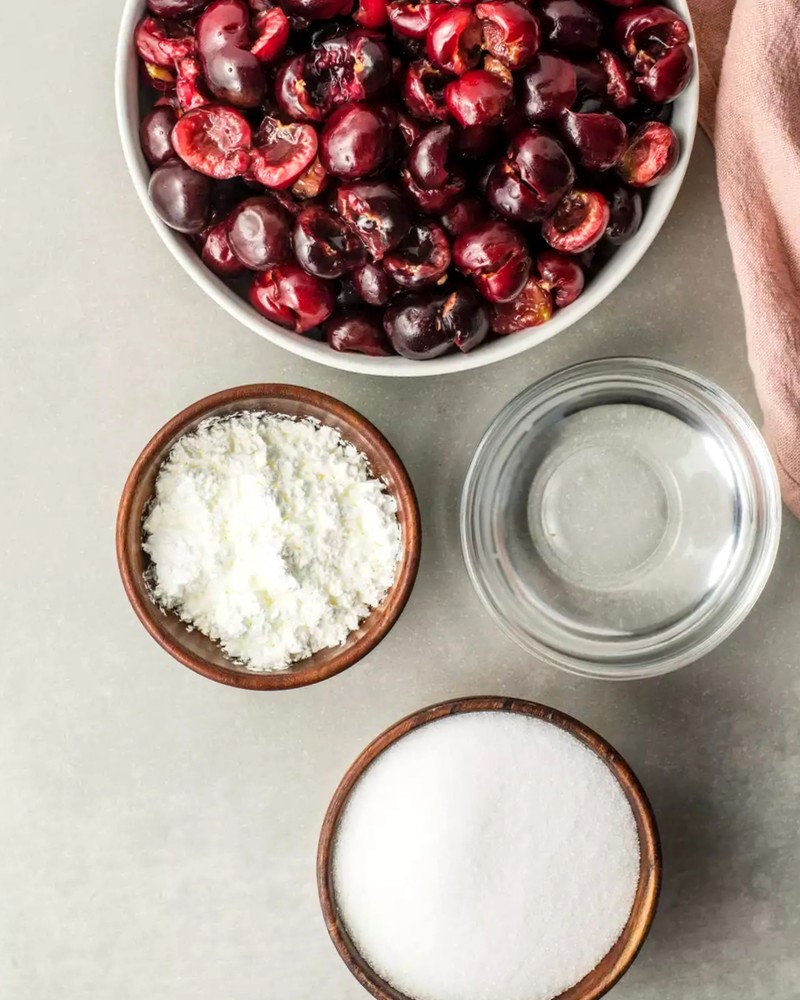 Подготовим необходимые продукты — моем и чистим вишню от косточек, отмеряем нужно количество сахара и кукурузного крахмала.