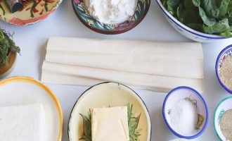 Вначале подготовьте все ингредиенты для приготовления пирога со шпинатом с сыром. Для основы заготовьте тонкое тесто фило (500 грамм), а для начинки: два вида сыра, белую часть зеленого лука, шпинат, яйца, сливочное масло, укроп, да специи и приправы.