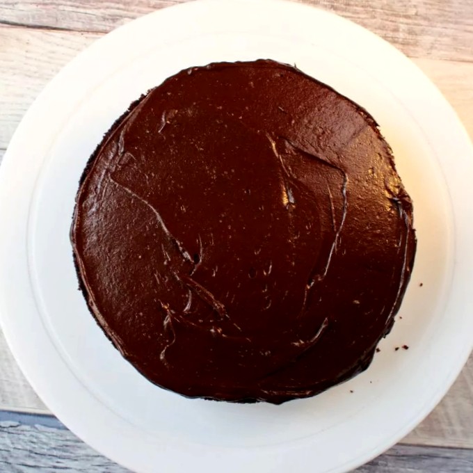 Смазываем верхушку первого коржа частью шоколадного крема, устанавливаем второй корж и также покрываем его кремом.