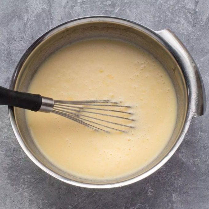 В другой миске взбейте яйца. Добавьте растопленное масло и взбивайте, пока смесь не станет однородной. Вмешайте молоко в смесь яиц и масла.