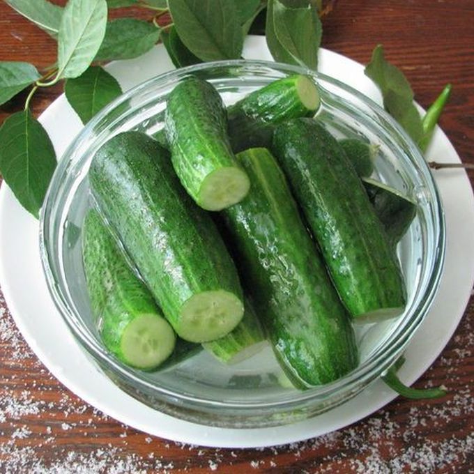 В отдельной посуде приготовьте рассол. Налейте воды 1,5 литра, доведите до кипения, всыпьте соль и сахар и прокипятите 5-8 минут. В конце влейте уксус, залейте огурцы рассолом и выложите горчицу с семенами.