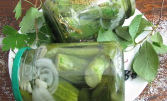 Воду вскипятите и залейте банки с огурцами, пусть постоят в воде два часа, после слить и залить второй раз кипящей водой. Пусть постоят еще 20 минут.