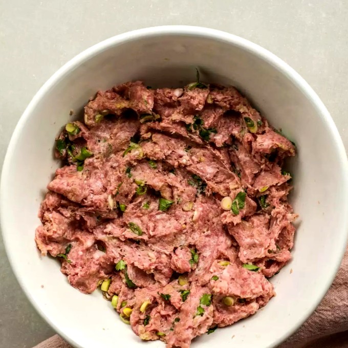 В удобной миске смешиваем свиной фарш с зелёным луком, кинзой и панировочными сухарями. Добавляем чёрный перец, 1 зубчик чеснока (измельчённый), соль и куриное яйцо. Хорошо перемешиваем.