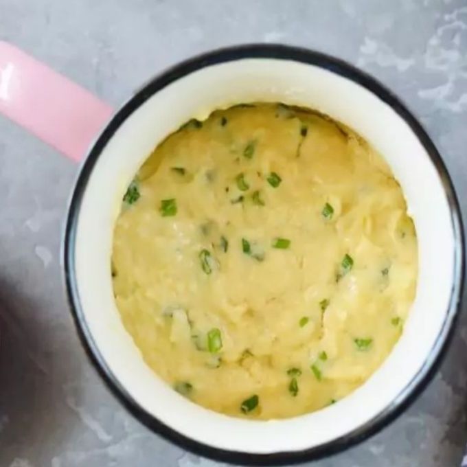 Добавьте 2 столовые ложки молока, 2 чайные ложки растительного или растопленного сливочного масла, пол яйца, 1 столовую ложку тертого сыра Чеддер и 3 штуки измельченного перышка зеленого лука.