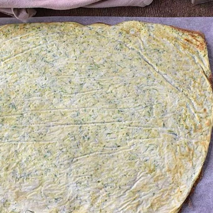 Достаньте базовый слой из кабачков из духовки и сдвиньте его с противня на ровную поверхность. Сверху накройте другим листом пергаментной бумаги и дайте немного остыть.