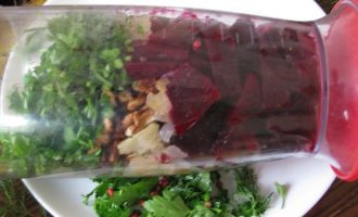 В рабочий стакан блендера выложите все подготовленные компоненты для свекольной икры, но в самом конце еще присоедините поджаренные на сухой сковородке зерна грецких орехов и перец красный горошком.